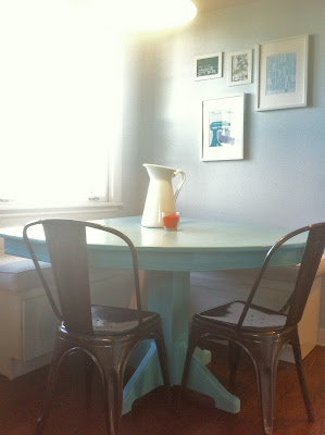 The table we purchased was such a lucky find! We were in the middle of remodeling our kitchen and had added bench seats in a corner near the windows. We came into the store in hopes of finding a small round or square table that would fit the corner benches. Imagine our joy at finding a table that fits like it was made for the space. We painted it a lovely, pale aqua blue to coordinate with our white and vintage-y kitchen feel and we love the results!